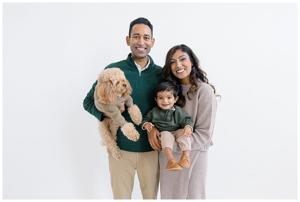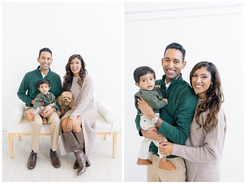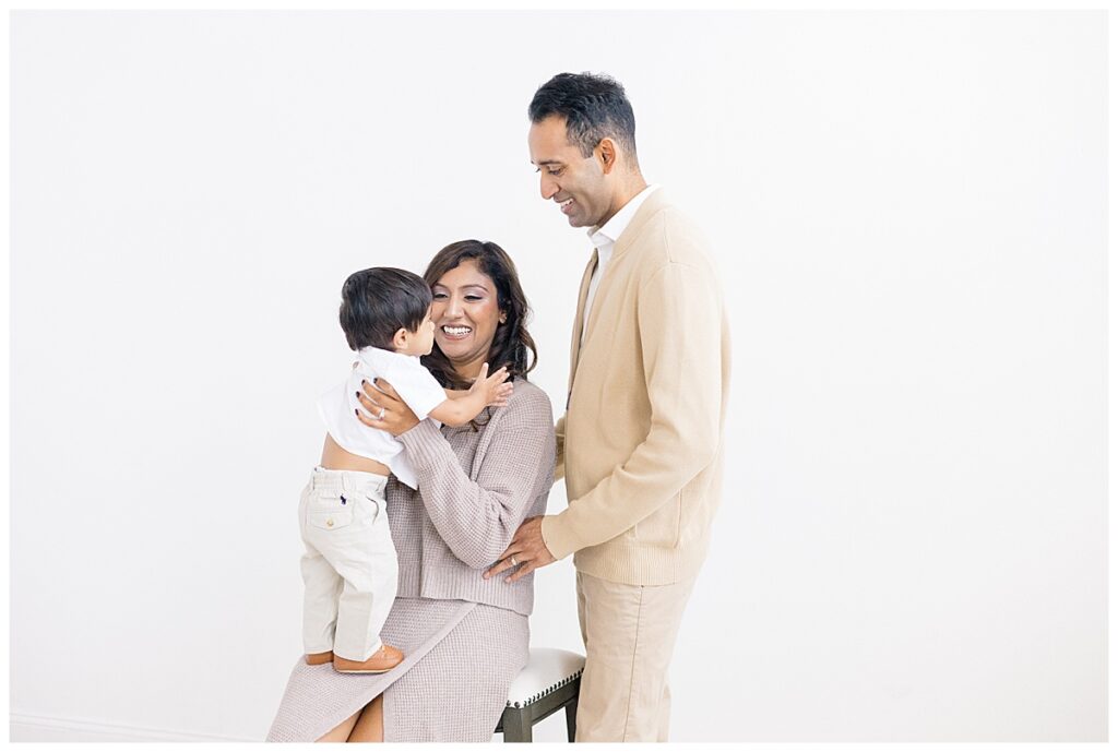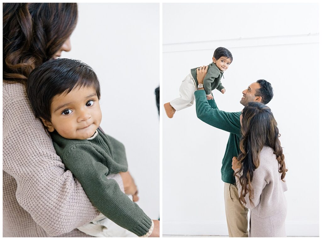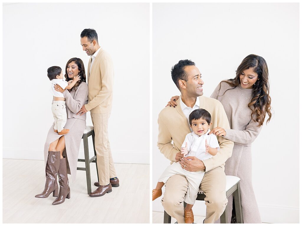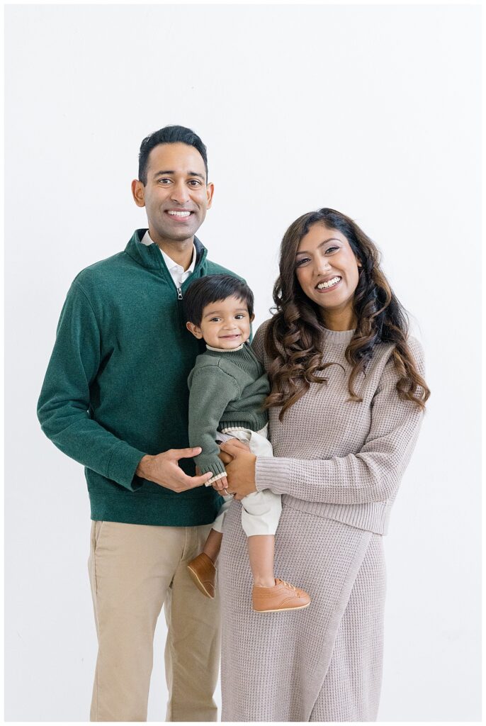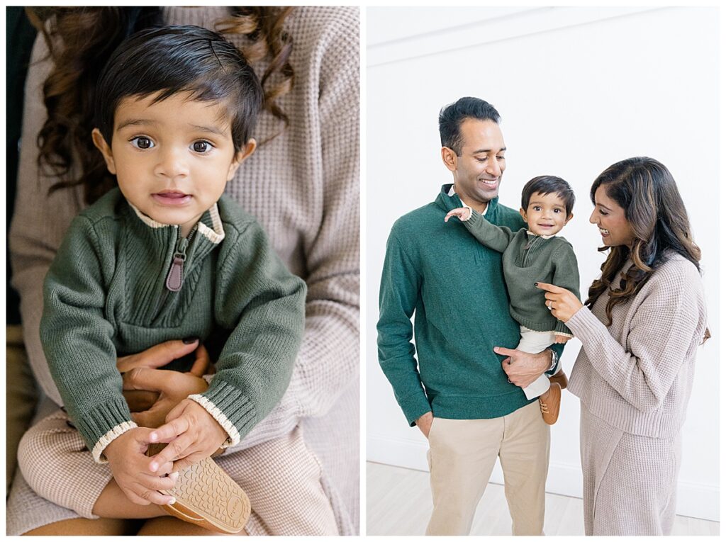 The family—Nitasha, Tejas, and Niam—looked amazing for their session. They dressed in neutral colors with a pop of green, which worked perfectly in the studio. And would look timeless in their portraits. Nitasha also had her hair and makeup done by Elegance by Ashley, one of our trusted artists. It’s an added perk at the Ali B Studio. We now offer professional hair and makeup services! Plus, clients have access to our client wardrobe, for a truly all-inclusive experience. Having everything in one place makes the day stress-free and lets families focus on enjoying their time together.