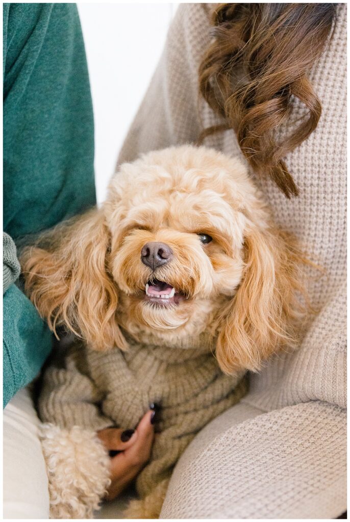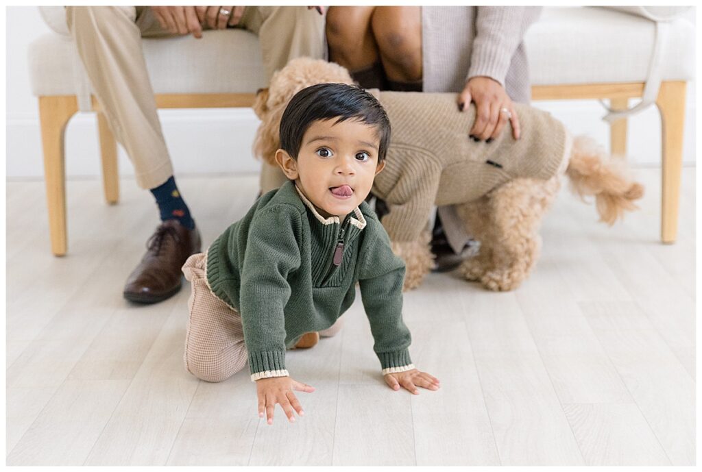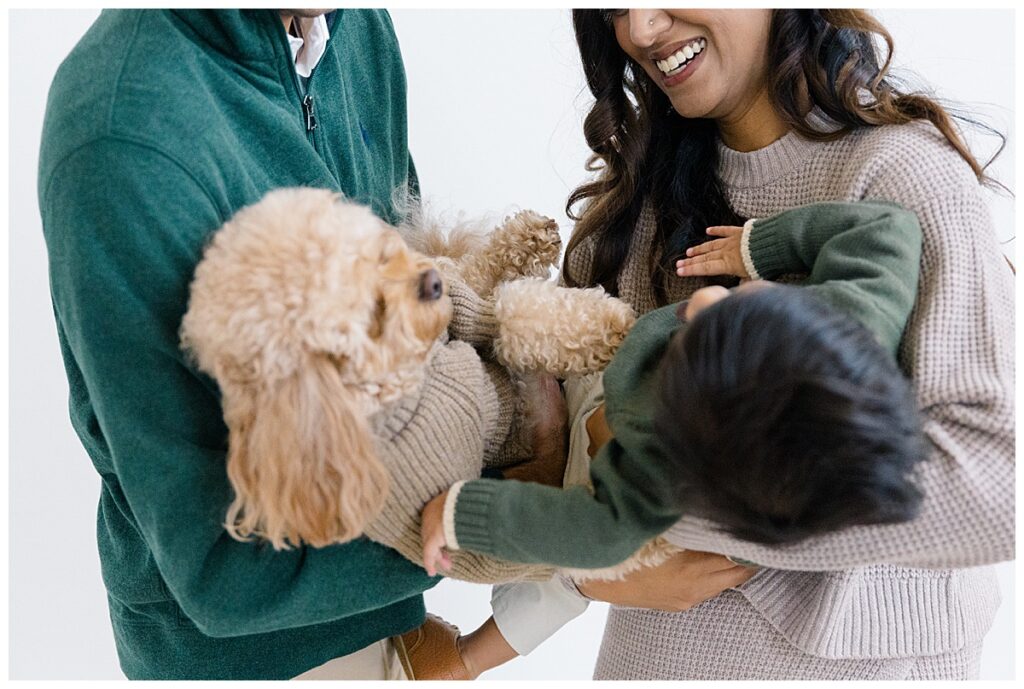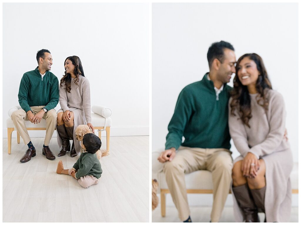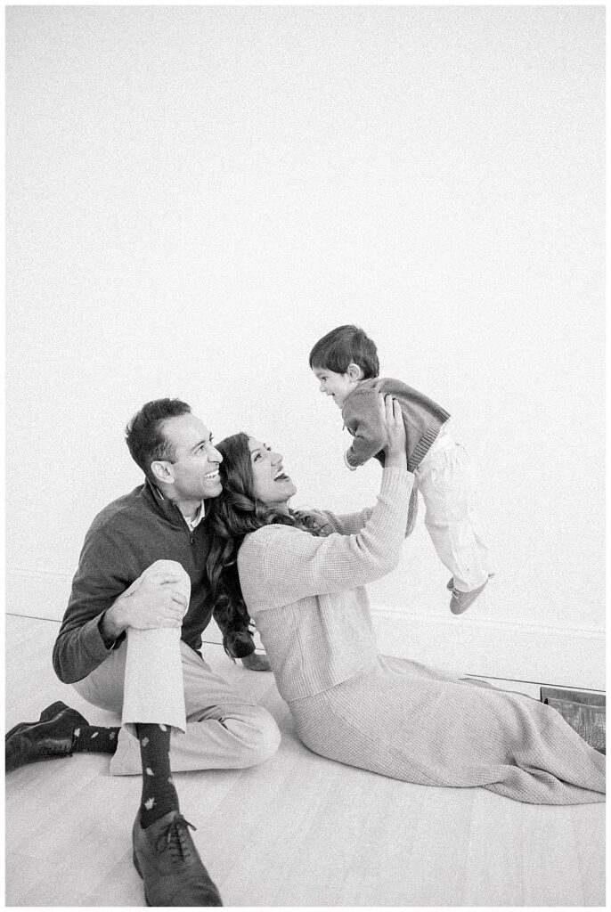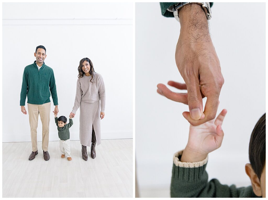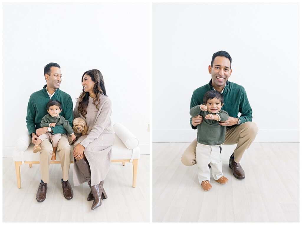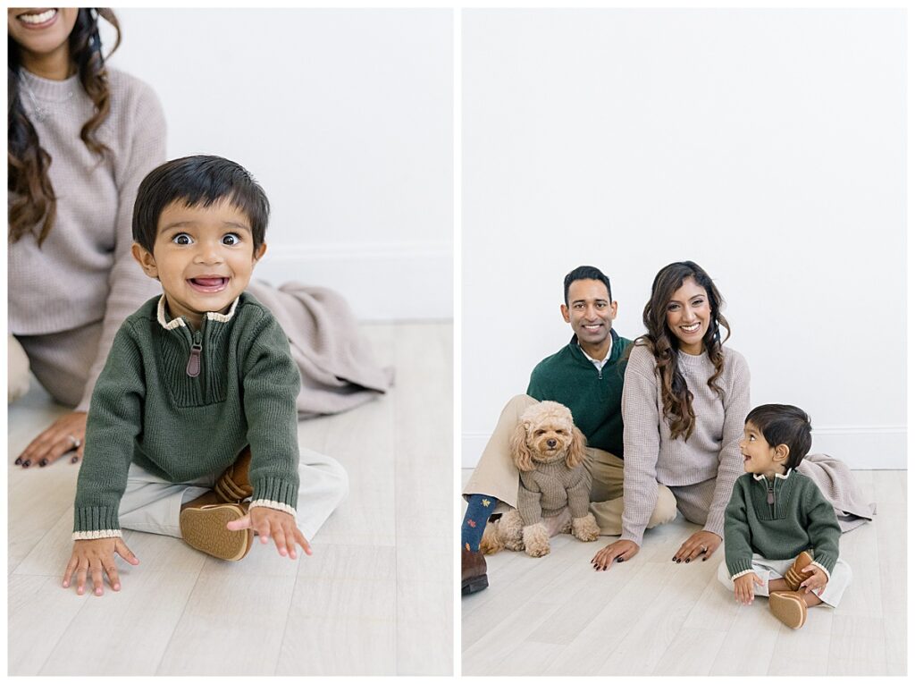 The family—Nitasha, Tejas, and Niam—looked amazing for their session. They dressed in neutral colors with a pop of green, which worked perfectly in the studio. And would look timeless in their portraits. Nitasha also had her hair and makeup done by Elegance by Ashley, one of our trusted artists. It’s an added perk at the Ali B Studio. We now offer professional hair and makeup services! Plus, clients have access to our client wardrobe, for a truly all-inclusive experience. Having everything in one place makes the day stress-free and lets families focus on enjoying their time together.