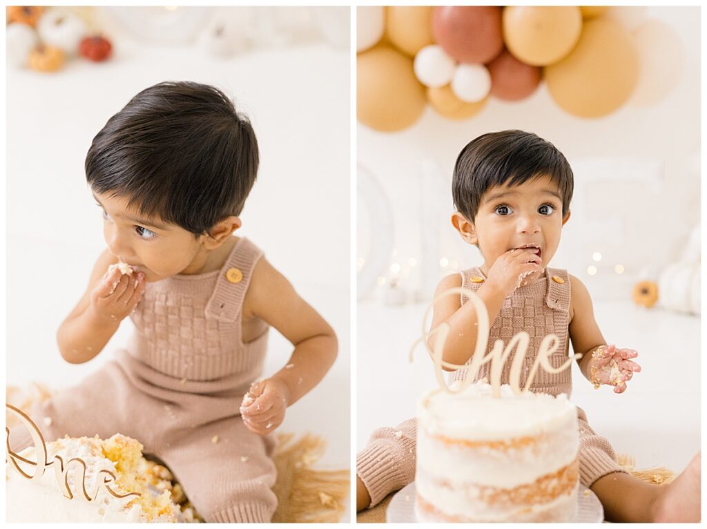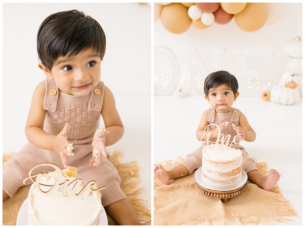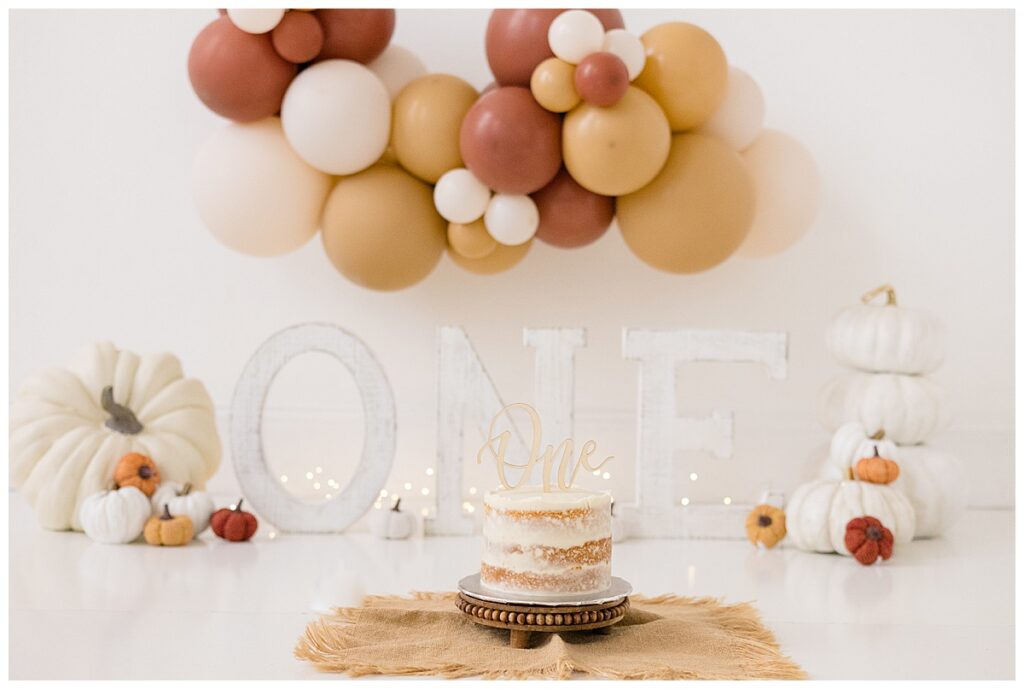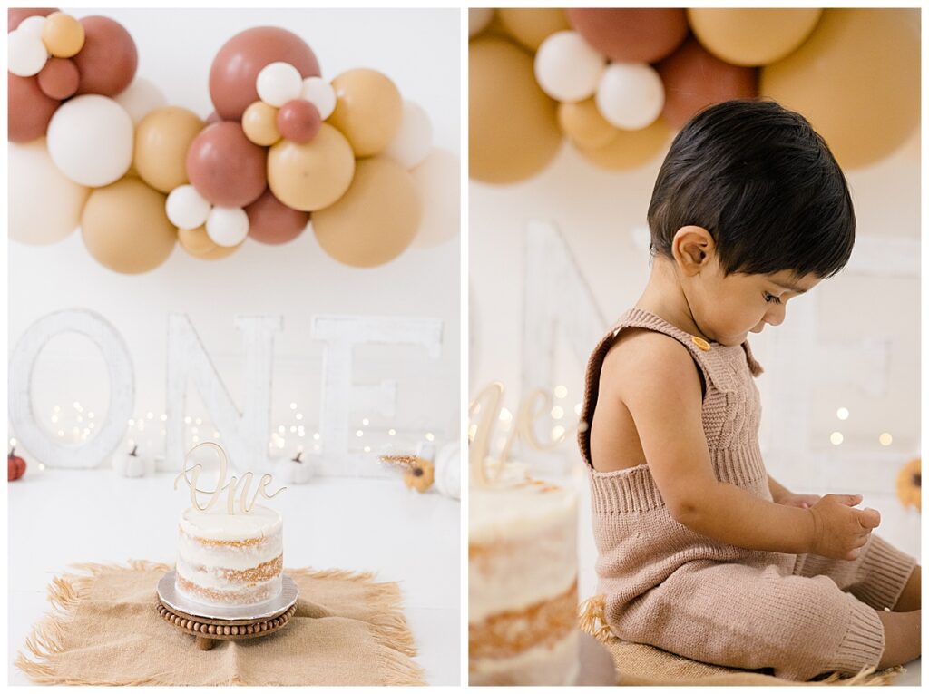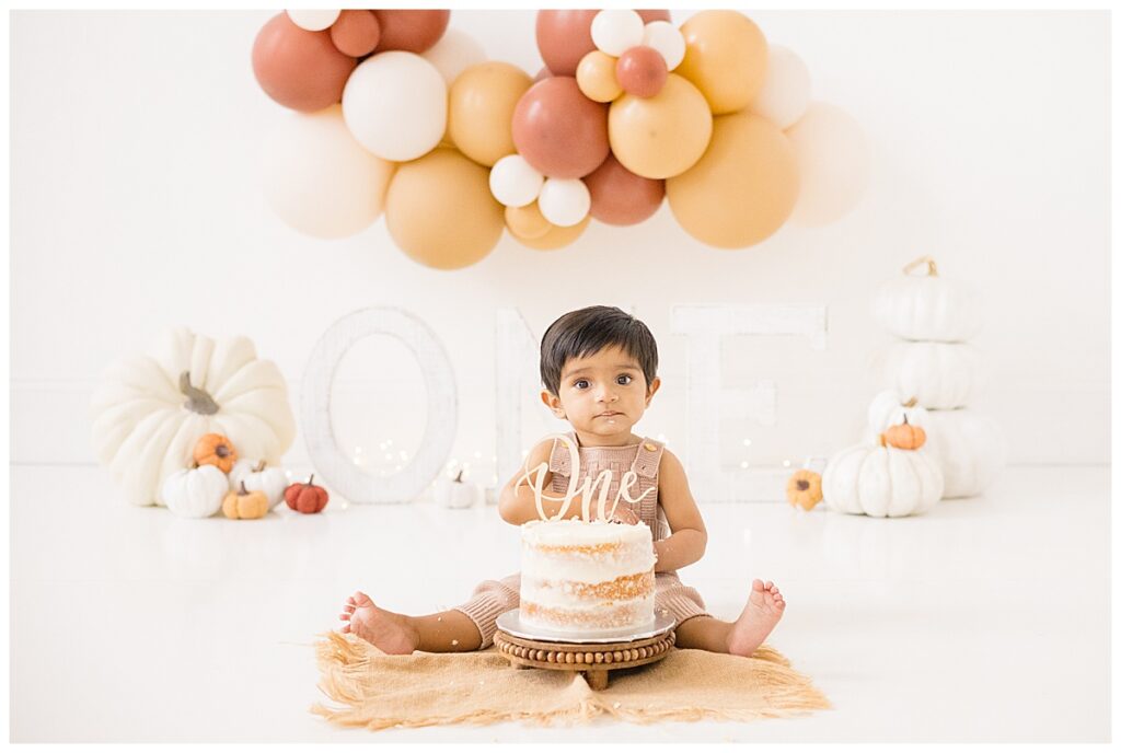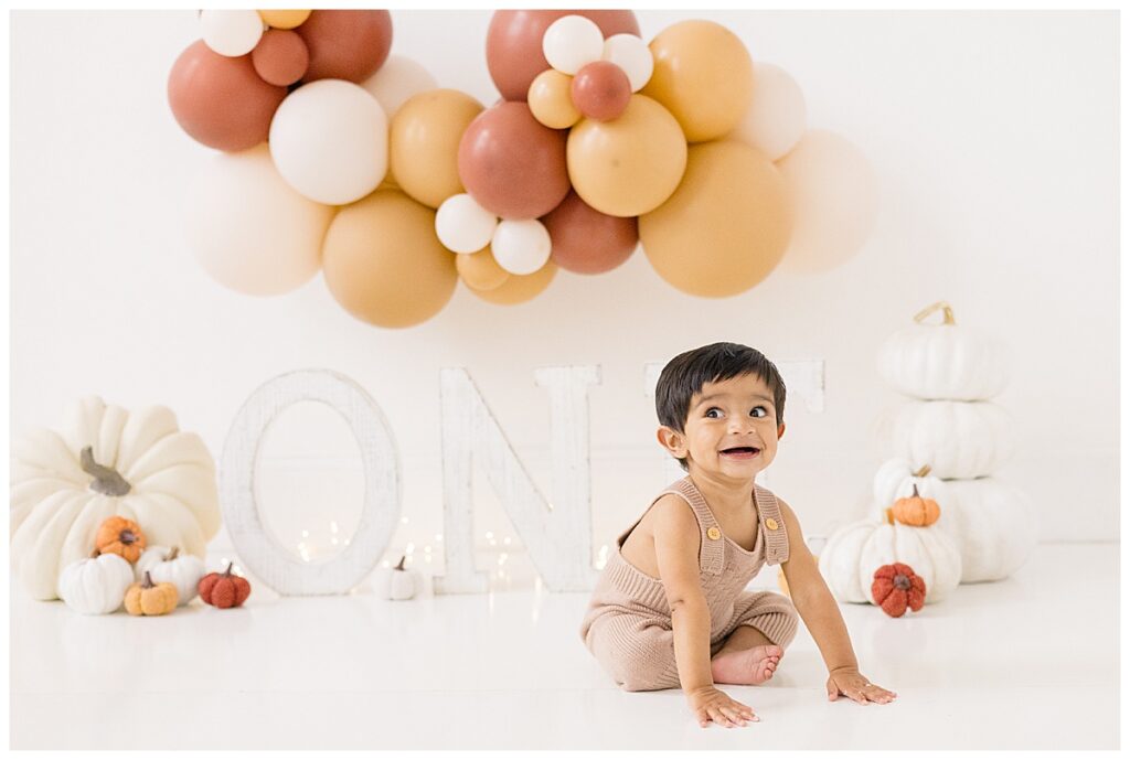 When we talked about the cake smash design, Nitasha envisioned neutral fall tones with pumpkins to reflect Niam’s October birthday. The setup came together beautifully—the cake was created by Kristen Chadbourne Cakes in Bedford, NH, and our balloon backdrop was designed by Ellie Piper & Co. out of Manchester. These local vendors helped bring her vision to life and gave the photos that perfect fall feel.