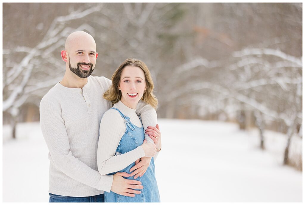 David and Sarah’s engagement session was one of those winter days that felt straight out of a storybook. Just days before Christmas, we met in one of the most beautiful spots in Amherst, New Hampshire, with rolling apple trees, mountain views in the distance, and a fresh blanket of snow covering the ground.