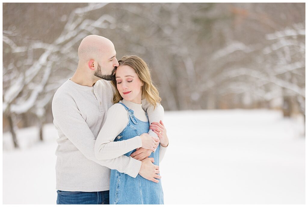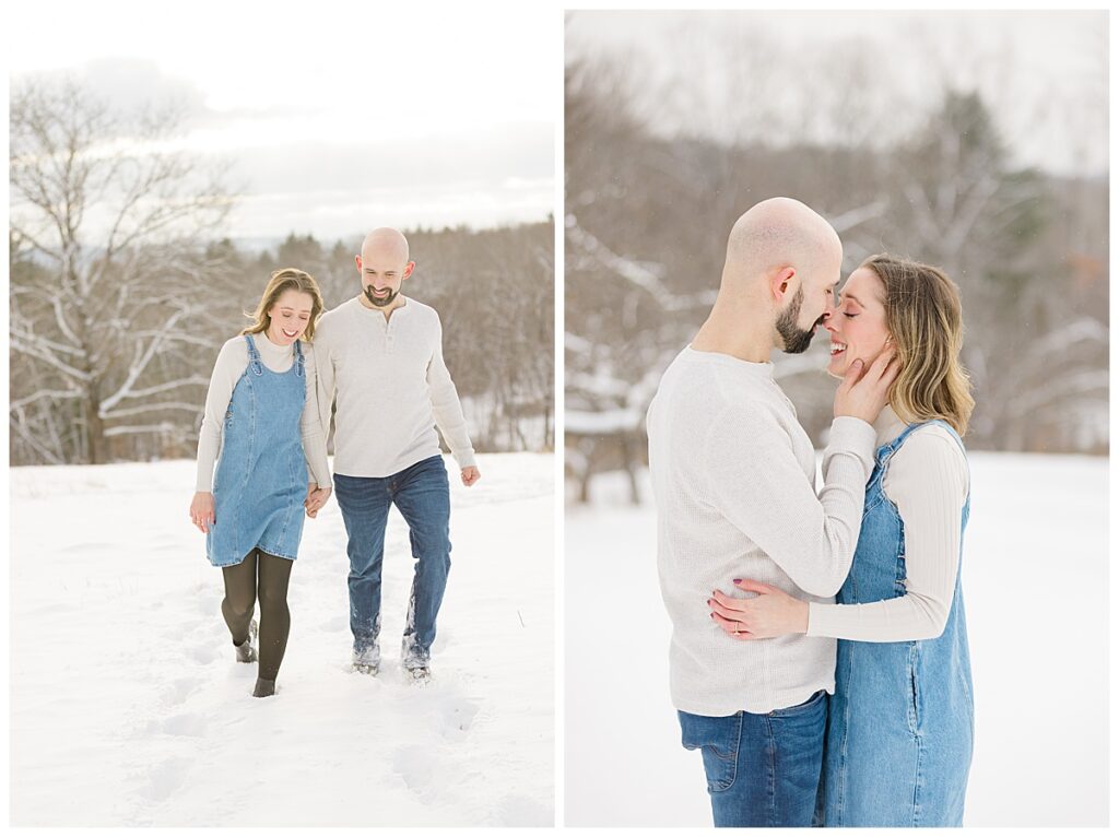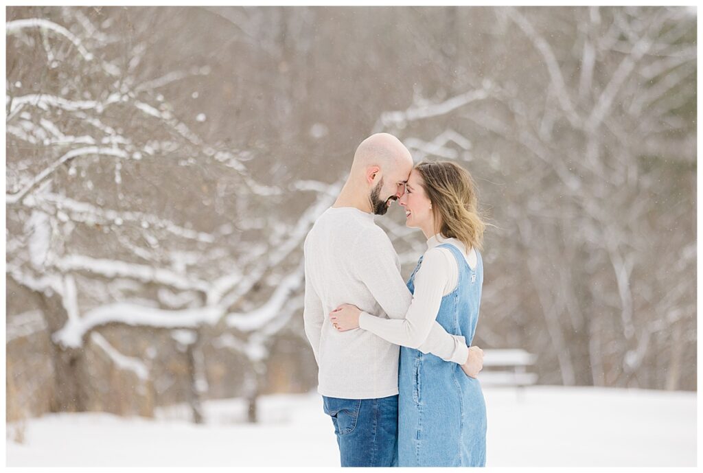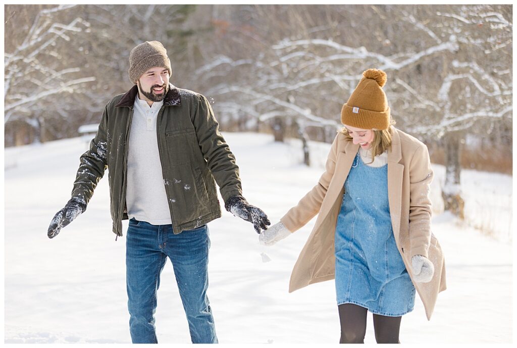 It had snowed just before our session, and as we started shooting, light flurries continued to fall—those soft, dreamy snowflakes that make everything feel calm and magical. Yes, it was cold (true New England winter!), but David and Sarah embraced it completely. From the very first moment, they were laughing, cozying up, and having so much fun together that you’d never know the temperature was dropping.